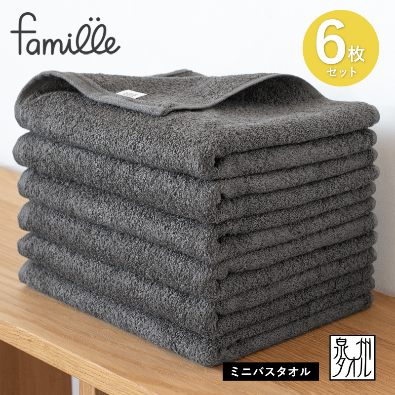 7. 【スピード発送】ファミーユ ミニバスタオル 6枚(チャコール) 【フェイスタオル 以上 バスタオル 未満 泉州タオル 吸水 普段使い シンプル 日用品 たおる】 G3522