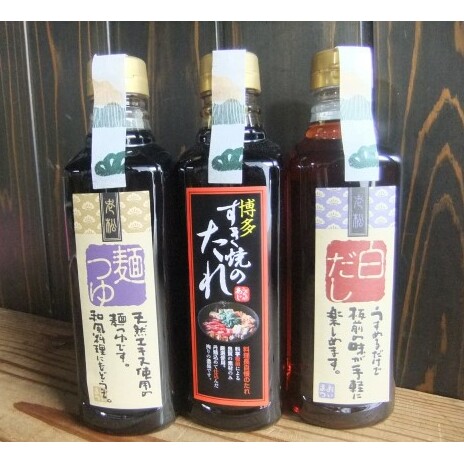 500ml 3本セット(「めんつゆ」・「白だし」・「すき焼きのたれ」 各1本)化粧箱入