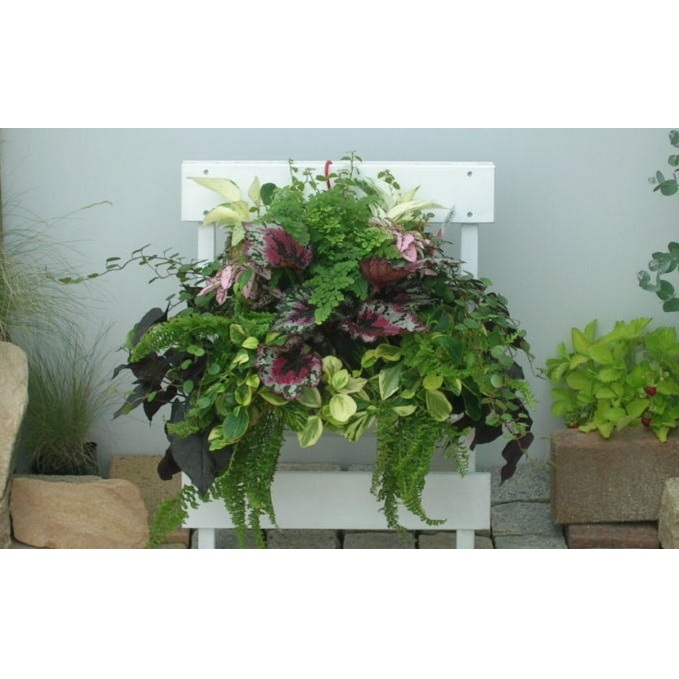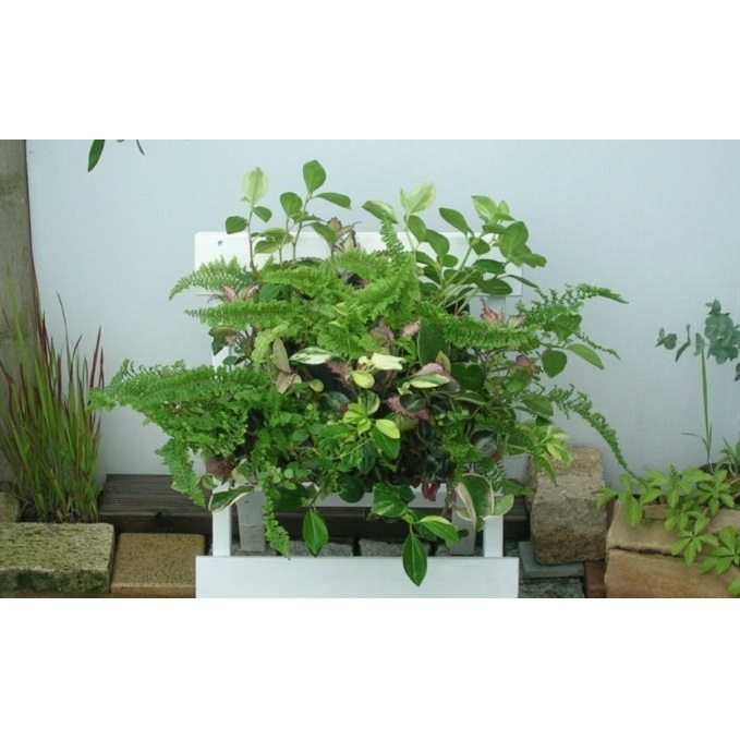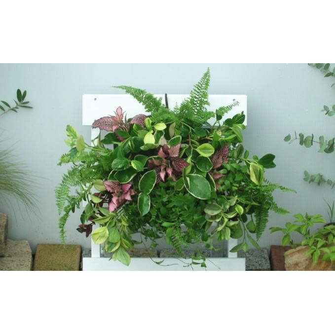 いろんなグリーンを沢山いれた観葉植物のハンギング。壁に掛けるタイプの観葉植物寄せ植え。屋外の軒下~室内、日陰でもOK。涼しげなグリーンの寄せ植えで華やかに。朝倉市のガーデニングショップ「四季の里」よりお届け致します。