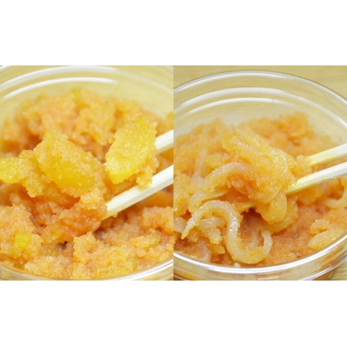 しっかりとした歯ごたえのある数の子とほんのり甘いイカに、無着色の博多辛子明太子をほどよく和えました。