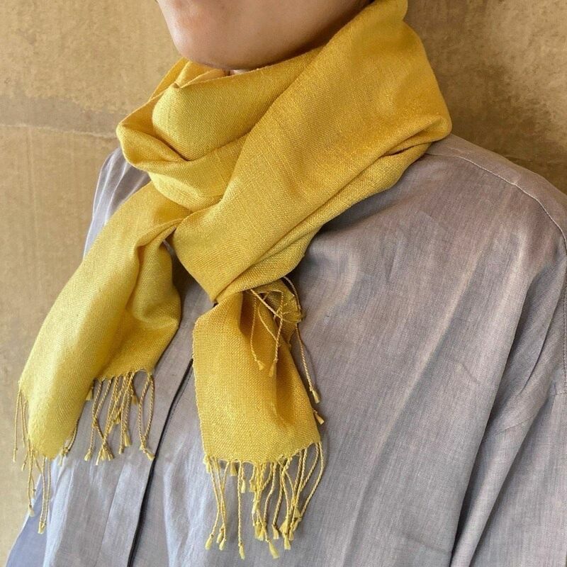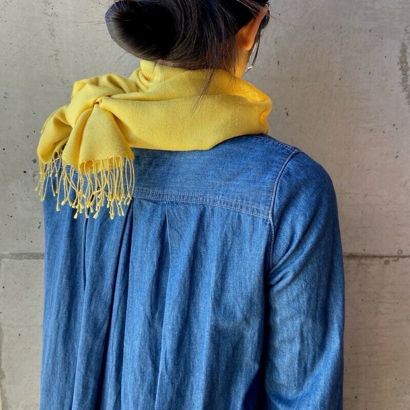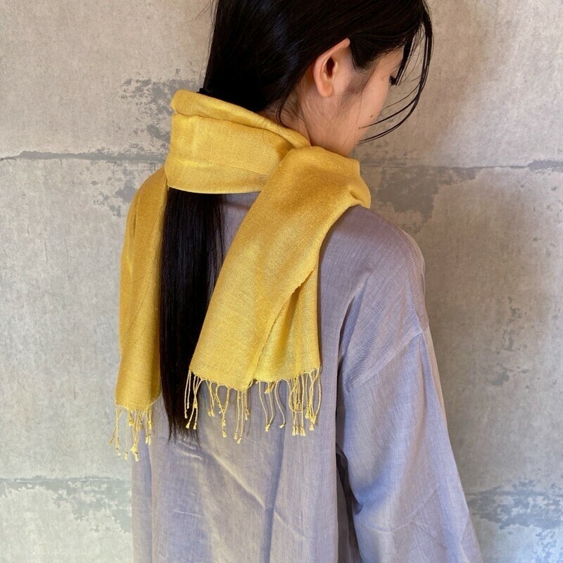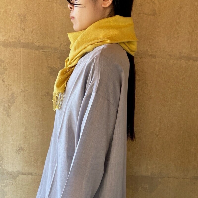 また、美しい光沢がある絹糸と、ふしのある真綿糸の二種類のシルク糸を織り交ぜることによって、ストールに柔らかな表情が生まれ、フォーマルでもカジュアルでもお楽しみいただける風合いとなっております。
