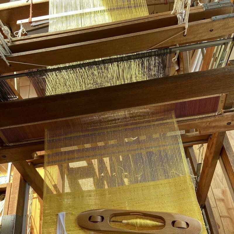 その蓮が内に秘めた、輝くような黄金色をシルク糸に染め上げ、やさしく丁寧に手織りいたしました。
