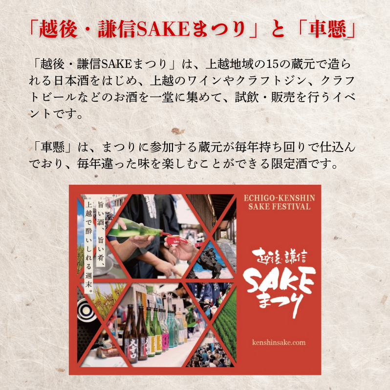 戦国の名将・上杉謙信公の戦術に由来するSAKEまつり限定酒「車懸」は毎年担当蔵が交替して仕込みを行っており、本年は上越酒造が担当。例年、会場限定での販売としてきましたが、リアルでSAKEまつりを楽しむことができない方でも「越後・謙信SAKEまつり」をご自宅で楽しんでいただけるようおちょこもセットにいたしました。ぜひ、ご堪能下さい。