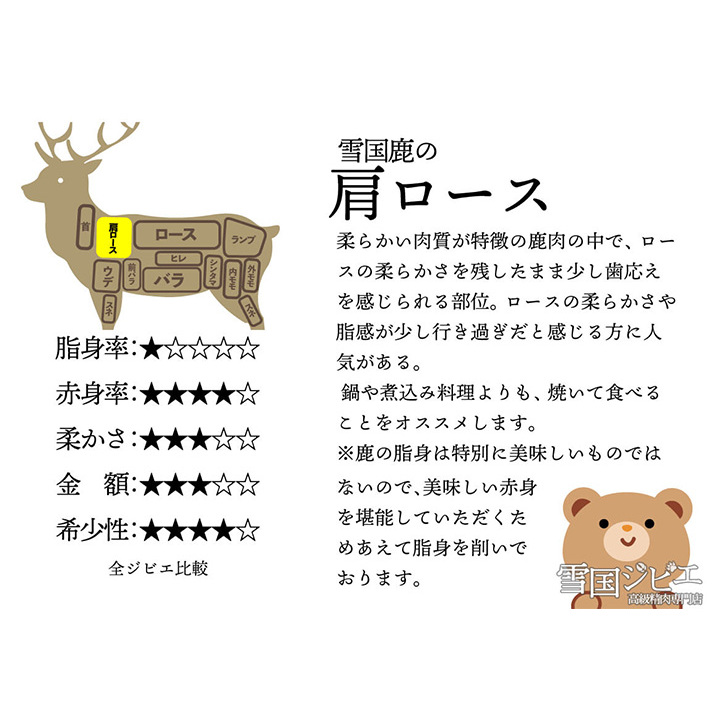※ 雪国シカは「肩ロース」の他に、「ロース・ランプ・外モモ・内モモ・シンタマ・スネ・ミンチ(ひき肉)」のお礼品登録もございます。