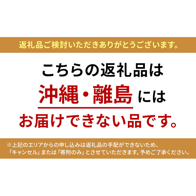 ※上記のエリアからの申し込みは返礼品の手配が出来ないため、「キャンセル」または「寄附のみ」とさせていただきます。予めご了承ください。