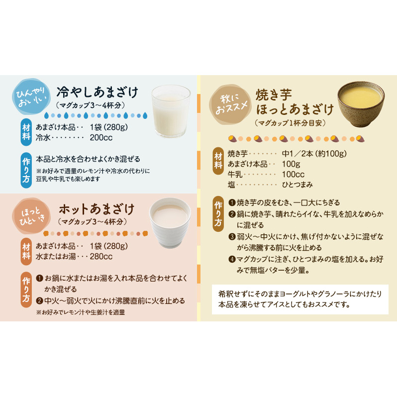 ※写真に掲載の果物は甘酒に含まれておりません。同量の本品と牛乳にお好みで果物を合わせてミキサーにかけてお召し上がる一例です。