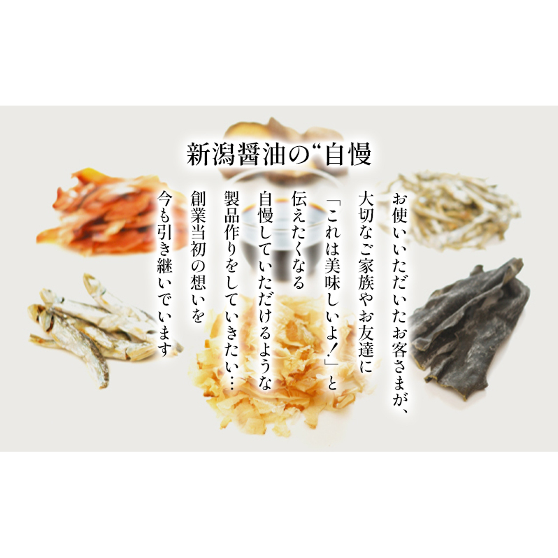 新潟県内では先駆けて製造を始めて60年以上が経つロングセラー商品で「我が家の味」として親しまれ、全国にファンを持つ万能タイプの「めんつゆ(5倍濃縮)」と、鰹の厚削り節からじっくりとダシを取った醤油屋の「白だし」、刺し身や寿司に良く合う本醸造・濃口で塩分控えめの「うす塩醤油」、エキス分の多い濃厚なみりん風の発酵調味料をセットしました。