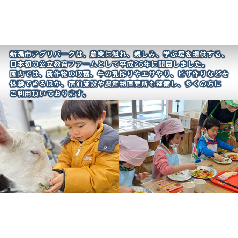 新潟市アグリパークは、農業に触れ、親しみ、学ぶ場を提供する、日本初の公立教育ファームとして平成26年に開園しました。園内では、農作物の収穫、牛の乳搾りやエサやり、ピザ作りなどを体験できるほか、宿泊施設や農産物直売所も整備し、多くの方にご利用頂いております。