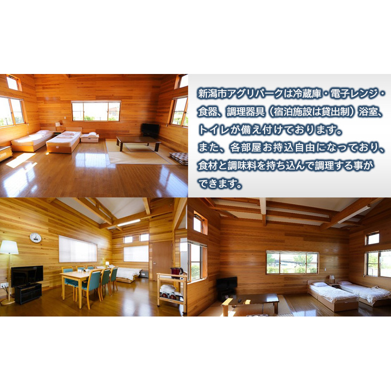(1)無料ご宿泊券1枚で、新潟市アグリパークのコテージ1棟に高校生以上の大人2名様・小学生又は中学生の小人2名様まで1回1泊無料でお泊り頂けます。