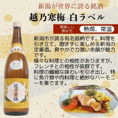 越乃寒梅 白ラベル 新潟市が誇る有名銘柄です。料理を引き立て、飽きずに楽しめる新潟の定番酒。爽やかで力強い余韻が魅力です。