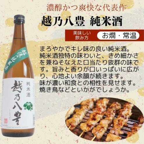 越の八豊 純米酒 まろやかでキレ味の良い純米酒。純米酒独特の濃醇な味わいと、きめ細かさを兼ねそなえた口当たり抜群の自信作です