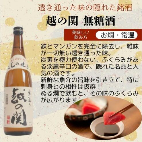 越の関 無糖酒 鉄とマンガンを完全に除去し、雑味が一切無い透き通った味。炭素を極力使わない、ふくらみがある淡麗辛口の酒。