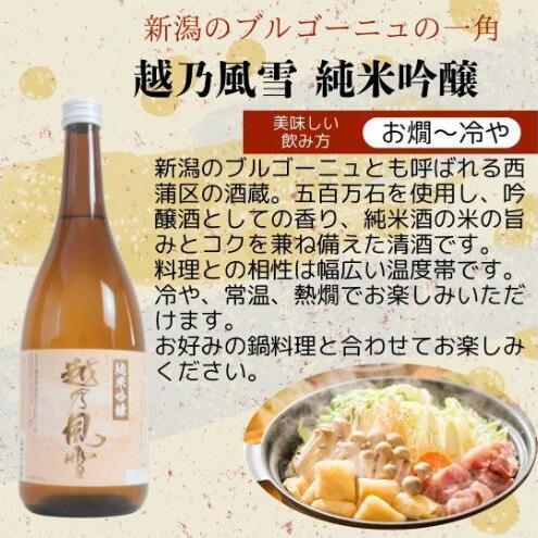 越の風雪 純米吟醸酒 五百万石を使用し、新潟印としての淡麗な味わいと、吟醸酒としての香り、純米酒の米の旨みとコクを兼ね備えた清酒です。