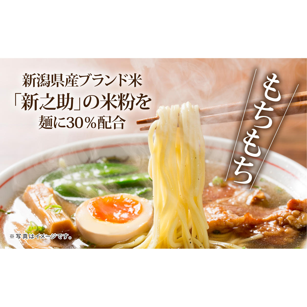 ラーメンの美味しさを決めるといっても過言ではない麺には、米どころ新潟が長い年月をかけて作り上げたブランド米「新之助」の米粉を30%使用。