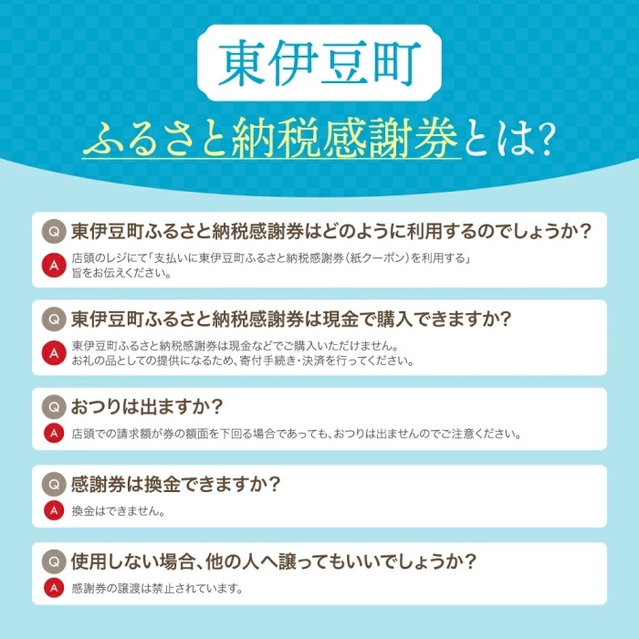 東伊豆町内のふるさと納税感謝券加盟店舗にて利用できる紙のクーポン券です。