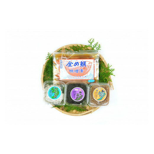 金め鯛味噌漬2切れ、わさび漬、生わさび海苔、わさび味噌(各80g)