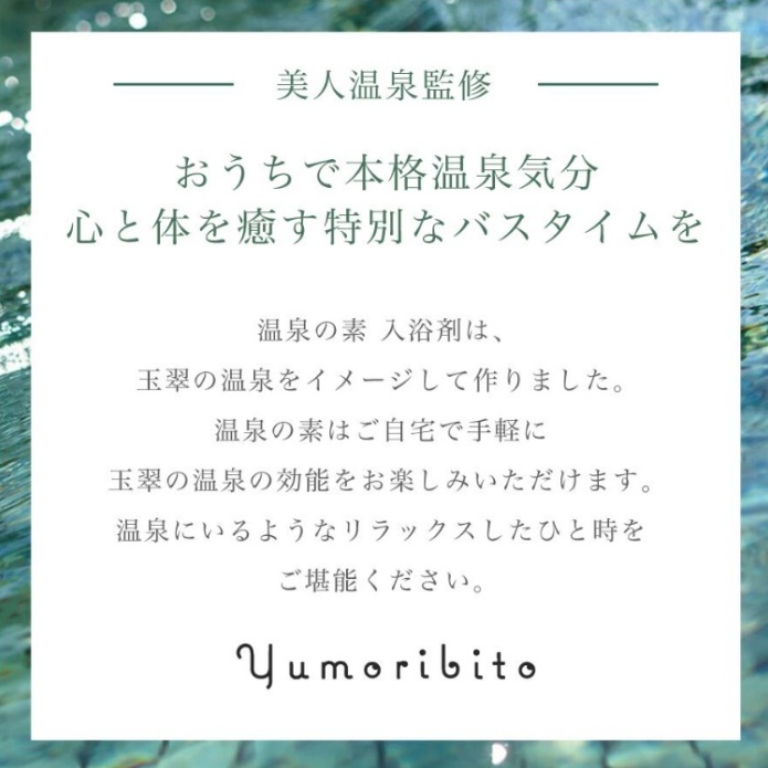 Yumoribito BATH POWDERは、熱川温泉 玉翠の温泉成分表を基に配合した、オリジナルの温泉の素(入浴剤)です。“美人肌の湯”の効能をご自宅のお風呂で温泉気分をお楽しみ下さい。