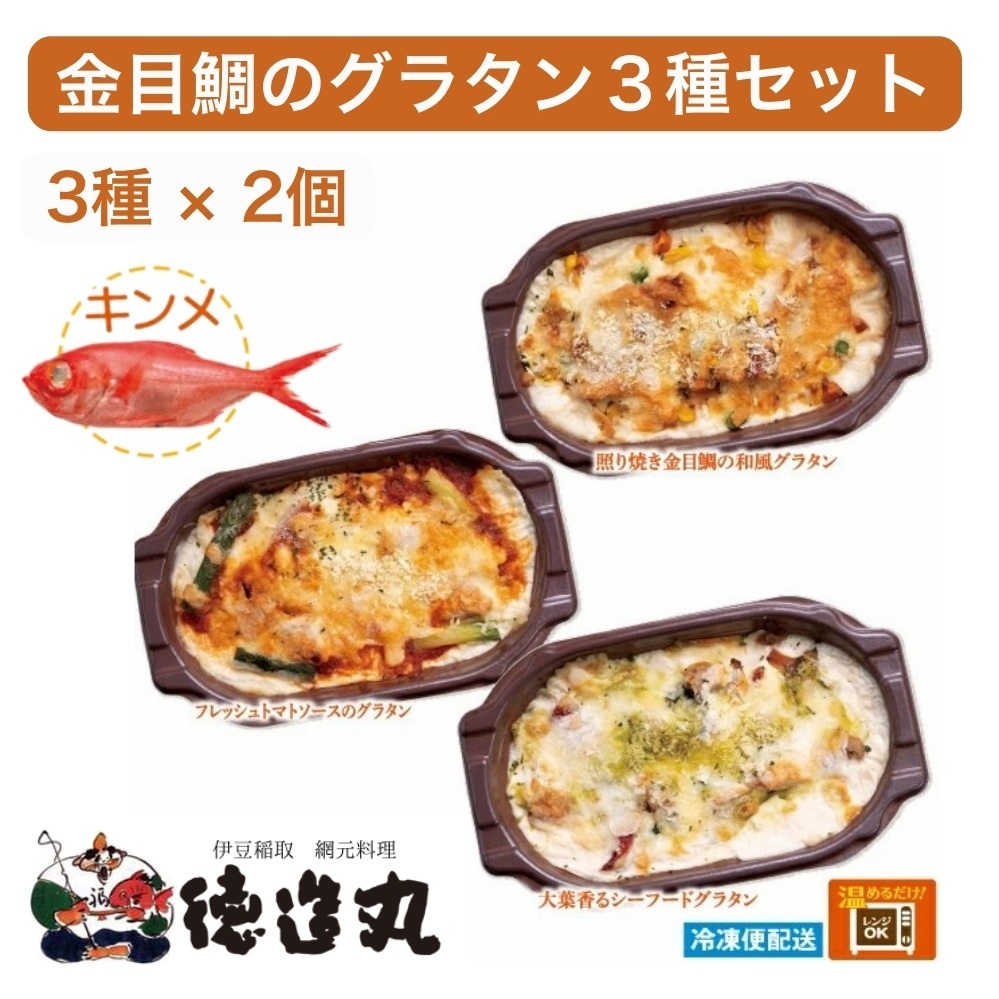 (冷凍)徳造丸 金目鯛のグラタン3種×2個のお試しセット(テリヤキ・大葉ジェノベーゼ・トマトソース 各2個) 1375 /金目 鯛 海鮮 静岡県 東伊豆町