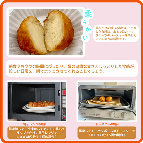 「ドーナツボール梨入り」は朝食やおやつの時間にぴったり。梨の自然な甘さとしっとりした食感が、忙しい日常を一瞬でホッとさせてくれることでしょう。梨入りドーナツボールの虜になること間違いなしです。