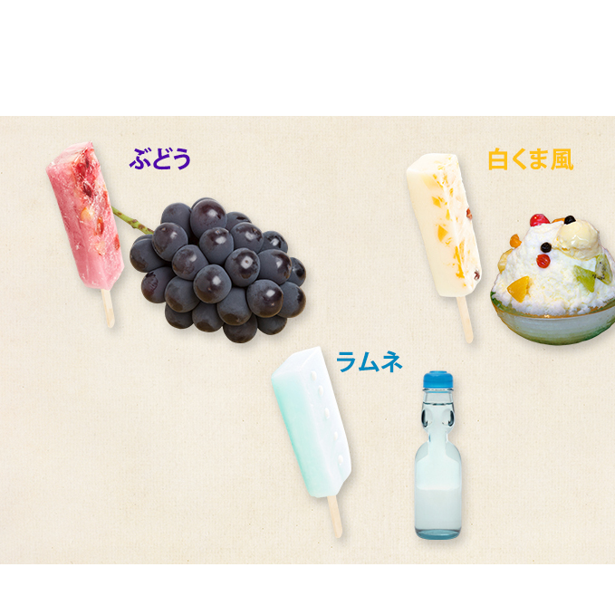 定番人気のいちご、みかん、白桃、ぶどうをはじめ、見た目も楽しいしろくま風、懐かしいラムネ、上品な宇治大納言、さっぱりカルピス、お子様にも人気のチョコバナナなど、バラエティ豊かなフレーバーの中からおまかせで20本をお届けします。どんな味が届くか、届いてからのお楽しみ!
