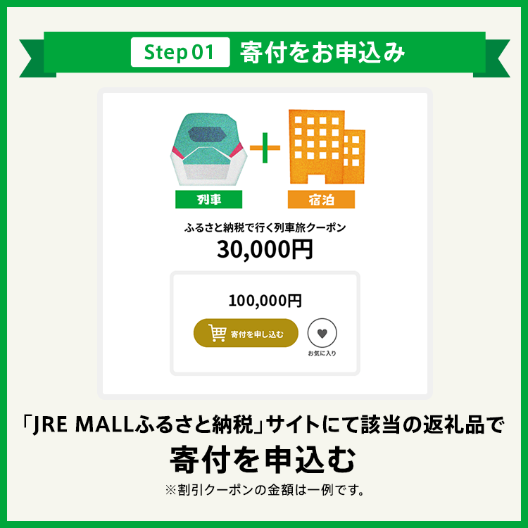 ・クーポンは払戻できませんのであらかじめご希望の列車・宿泊施設の残席・残室をお確かめの上、寄付いただきますようお願いいたします。また、クーポンご利用時にご希望の列車・宿泊施設の残席・残室状況や宿泊施設休館等によりご希望に沿えない場合がございます。予めご了承ください。