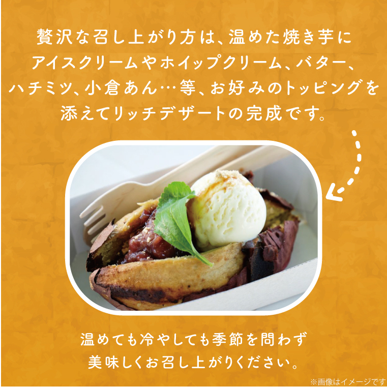 贅沢な召し上がり方は、温めた焼き芋にアイスクリームやホイップクリーム、バター、ハチミツ、小倉あん…等、お好みのトッピングを添えてリッチデザートの完成です。