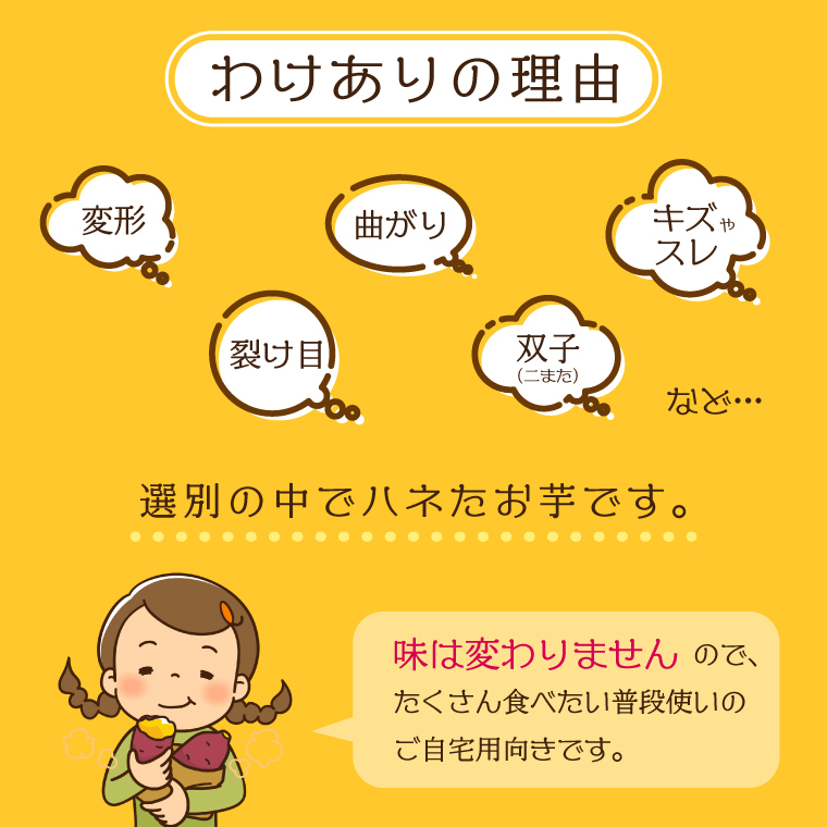 ※形に変形、曲がりがある、皮の色つやが控えめである、キズやスレ、裂け目、双子(二また)があるなどで、選別の中でハネたお芋です。