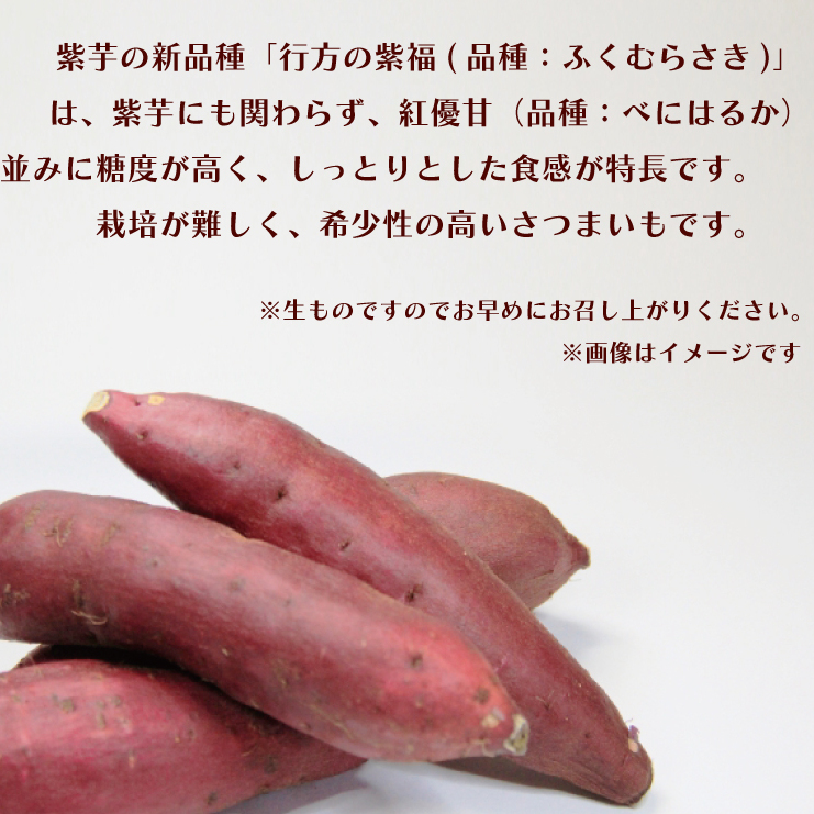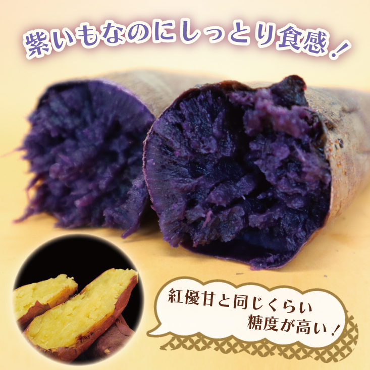 紫芋の新品種「行方の紫福(品種:ふくむらさき)」は、紫芋にも関わらず、紅優甘(品種:べにはるか)並みに糖度が高く、しっとりとした食感が特長です。