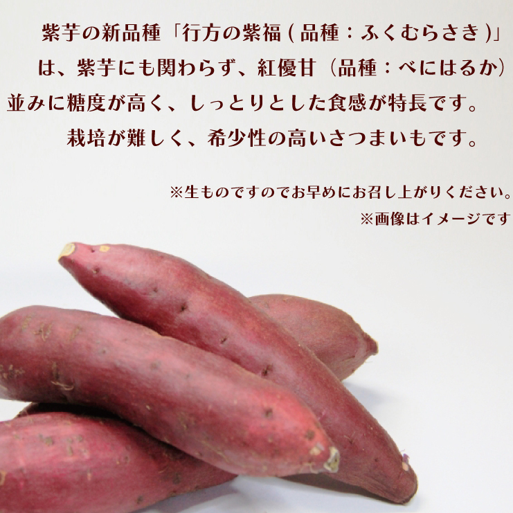 紫芋の新品種「行方の紫福(品種:ふくむらさき)」は、紫芋にも関わらず、紅優甘(品種:べにはるか)並みに糖度が高く、しっとりとした食感が特長です。