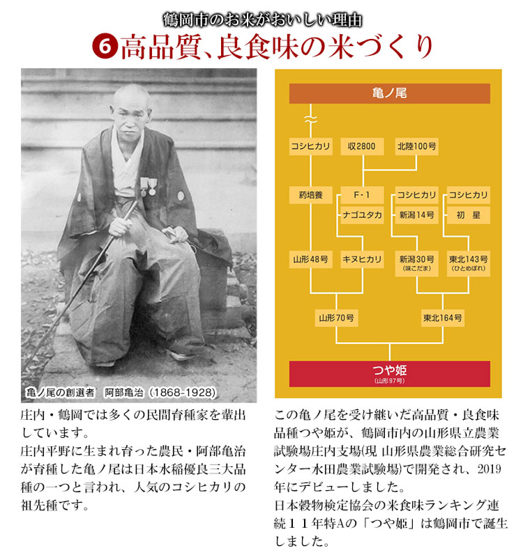 日本一を誇るブナの原生林が育む滋養に満ちた水系、先人の知恵と四季鮮やかな山形の風土が生んだ、わが国の美味しいお米のルーツとなる「亀ノ尾」。 その正統の系譜から生まれたブランド米です。 際立つ「つぶの大きさ」「白い輝き」「香り」「粘り」ごはんそのものがご馳走。 山形の農の匠が丹精込めて育てる、安全でおいしさを極めた特別なお米。 日本中の、何よりも「白いごはん」が大好きな人にお届けします。