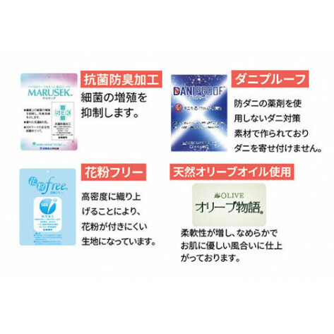 また、側生地は、花粉が付きにくい花粉フリー(防汚加工)、ダニを通しにくいダニプルーフ加工、繊維を清潔に保つSEK加工、天然バージンオリーブオイルの柔軟加工を施しています。