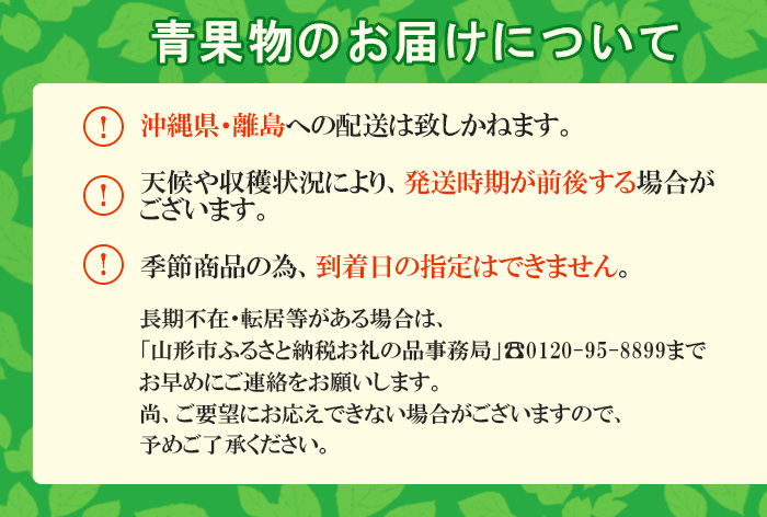 ※商品お受取り後、すぐに商品の状態をご確認ください。お礼の品の発送には万全を期しておりますが、万が一ひどい傷み等があった場合は、写真・画像を添付の上お早めに「山形市ふるさと納税お礼の品事務局」までご連絡ください。尚、お時間が過ぎてからの対応は致しかねます。