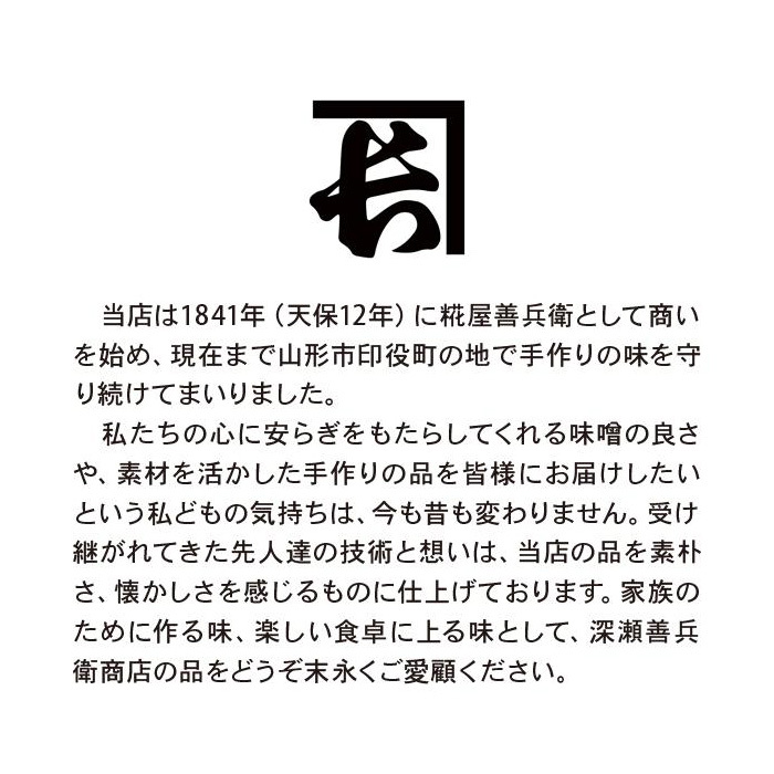 深瀬善兵衛商店は1841年(天保十二年)より糀屋として商いを始めました。甘酒は明治の頃より作り始め、今でも市内の神社の元旦除夜祭に振舞い甘酒としてご利用いただいております。