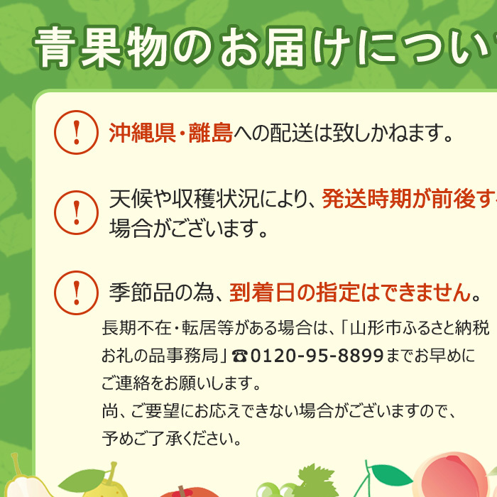 ○さくらんぼは大変デリケートな果物です。ちょっとした揺れやお隣のさくらんぼとぶつかってしまうと痛みが生じる場合がございます。発送の際は十分に気をつけてお届けしますが、到着後はすぐに中身をご確認頂き、冷蔵庫に入れてお早めにお召し上がり下さい。