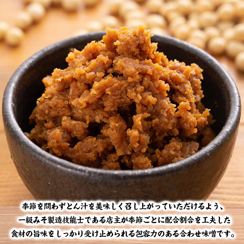 季節を問わずとん汁を美味しく召し上がっていただけるよう、一級みそ製造技能士である、店主深瀬尚子が季節ごとに配合割合を工夫した合わせ味噌です。