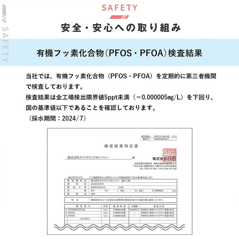 JAS規格を大きく上回る純度の炭酸ガスをライフドリンクカンパニー社内の最高レベルで注入。