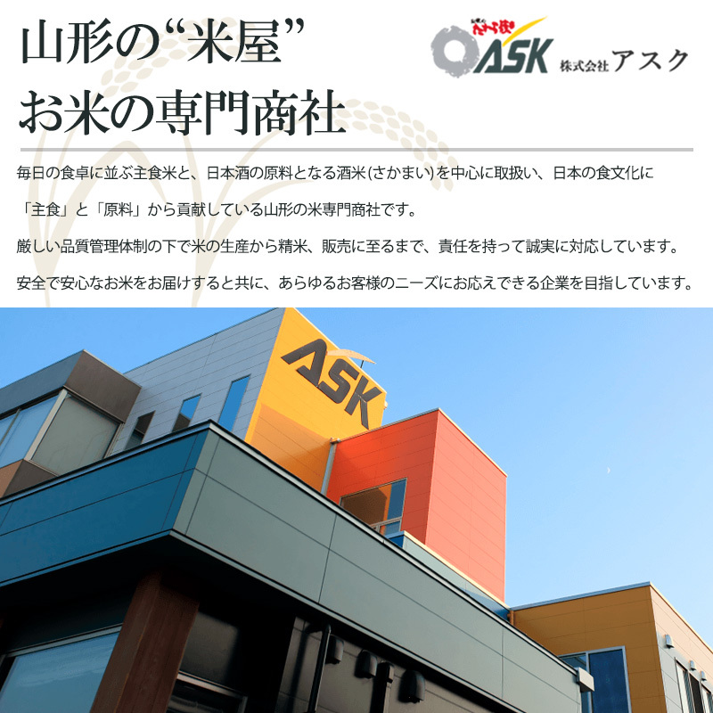 【山形県内で生産された玄米を山形市内で精白(石の除去、計量、精米、砕米選別、色彩選別、包装、金属探知)した地場産品です。】