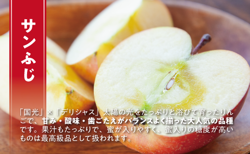 サンふじは、程よい酸味・糖度・果汁・歯ごたえ、さらに保存性が高くすべてが揃った最も人気の高い品種です。