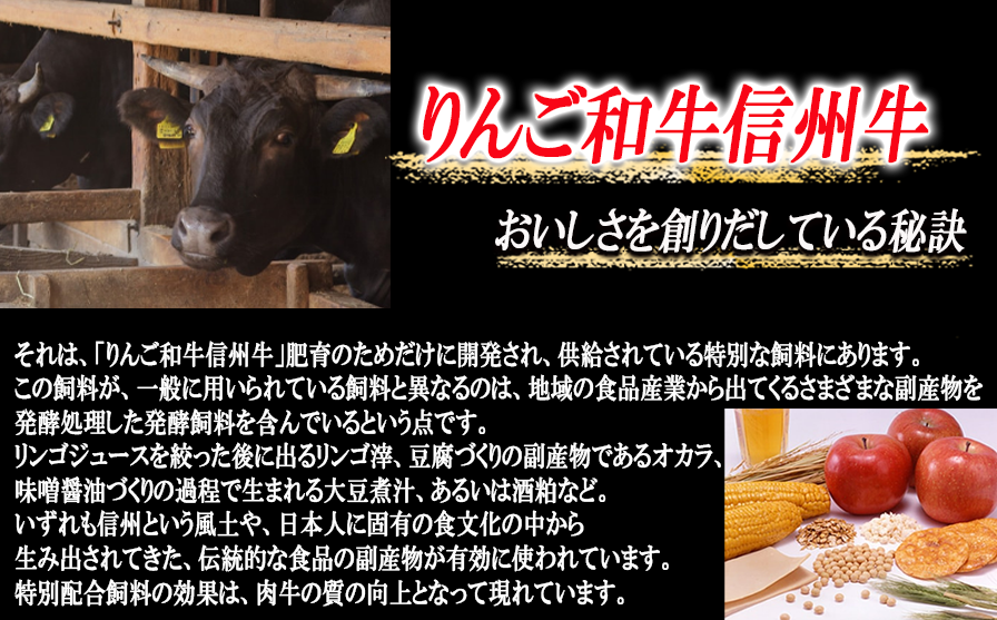 「りんご和牛」信州牛は、特製のりんご入り発酵飼料を用いて育ちました。