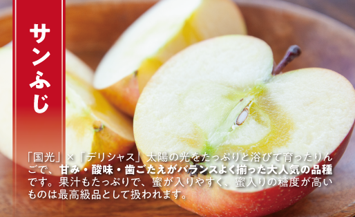 サンふじは、太陽の光をたっぷり浴びて栽培され、濃厚な甘みと、程よい酸味の絶妙なバランスが特徴です。