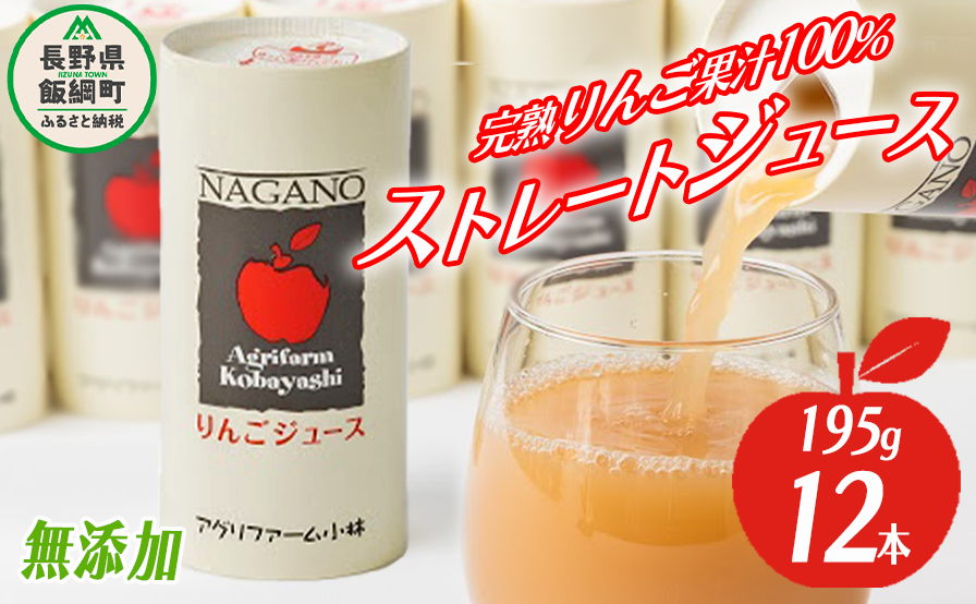 りんごジュース 195g×12本 無添加 酸化防止剤不使用 果汁100% カート缶 アグリファーム小林 沖縄県配送不可お申込み順に発送予定 信州の環境にやさしい農産物認証 14000円 長野県 飯綱町 [1693]
