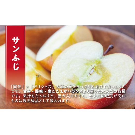 <飯綱町最北端のりんご農園が作るサンフジ>太陽の光をいっぱいに浴びた、ジューシーなりんご。標高が高く寒暖差の大きい環境で育った相澤農園のサンふじは、実が締まって甘みもしっかりと乗っています。その美味しさから年々リピーター様が増えており、年に3~4回ご注文される方もいらっしゃいます。