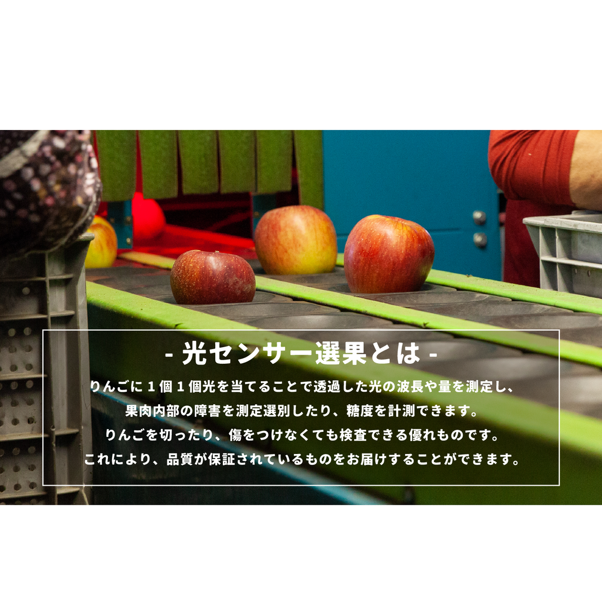 「感謝りんご」は、家庭用りんごでは通常実施しない光センサー選果にて、中身に腐りがないことを確認し、糖度測定で12度以上の美味しいりんごのみを梱包したふるさと納税返礼品専用の商品です。