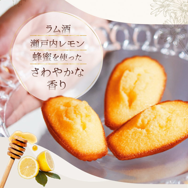 砂糖、卵、バター、小麦粉、洋酒、レモン、蜂蜜、食塩、ベーキングパウダー