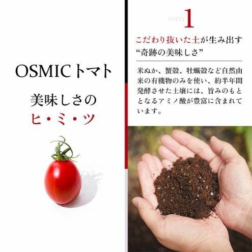OSMICトマト mini Premiumは、千葉市のブランド「千」にも認定されているOSMICトマトを代表するトマトです。化学肥料を一切使用せず、蟹殻や牡蠣殻など自然のものだけで作った自社開発の土“オスミックソイル”。その活きた土で育てた、甘みと旨味がギュッと詰まった平均糖度10~11度の高糖度ミニトマト。2019年度日本野菜ソムリエ協会主催の「トマトグランプリ」でも総合優勝しており、有名シェフや料理家などプロも認めた逸品です。