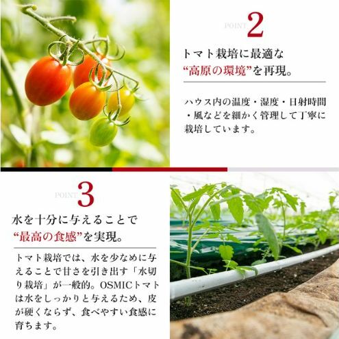 OSMICトマト mini Premiumは、千葉市のブランド「千」にも認定されているOSMICトマトを代表するトマトです。化学肥料を一切使用せず、蟹殻や牡蠣殻など自然のものだけで作った自社開発の土“オスミックソイル”。その活きた土で育てた、甘みと旨味がギュッと詰まった平均糖度10~11度の高糖度ミニトマト。2019年度日本野菜ソムリエ協会主催の「トマトグランプリ」でも総合優勝しており、有名シェフや料理家などプロも認めた逸品です。
