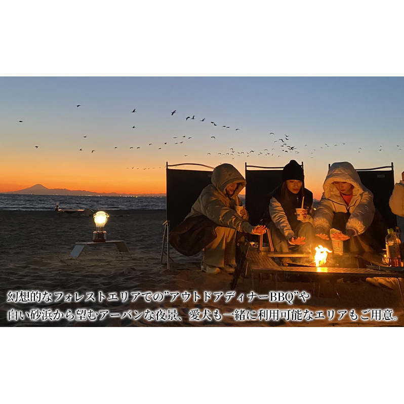 幻想的なフォレストエリアでの”アウトドアディナーBBQ”や白い砂浜から望むアーバンな夜景、愛犬も一緒に利用可能なエリアもご用意。
