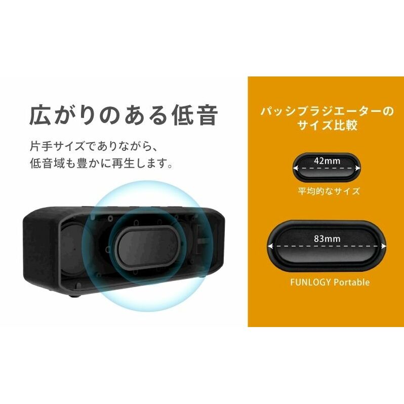 FUNLOGY Portableは、Bluetooth(ver.5.3)を搭載した小型ポータブルスピーカーです。お手持ちのスマートフォンやパソコンと接続して、ワイヤレススピーカーとして手軽に使用できます。