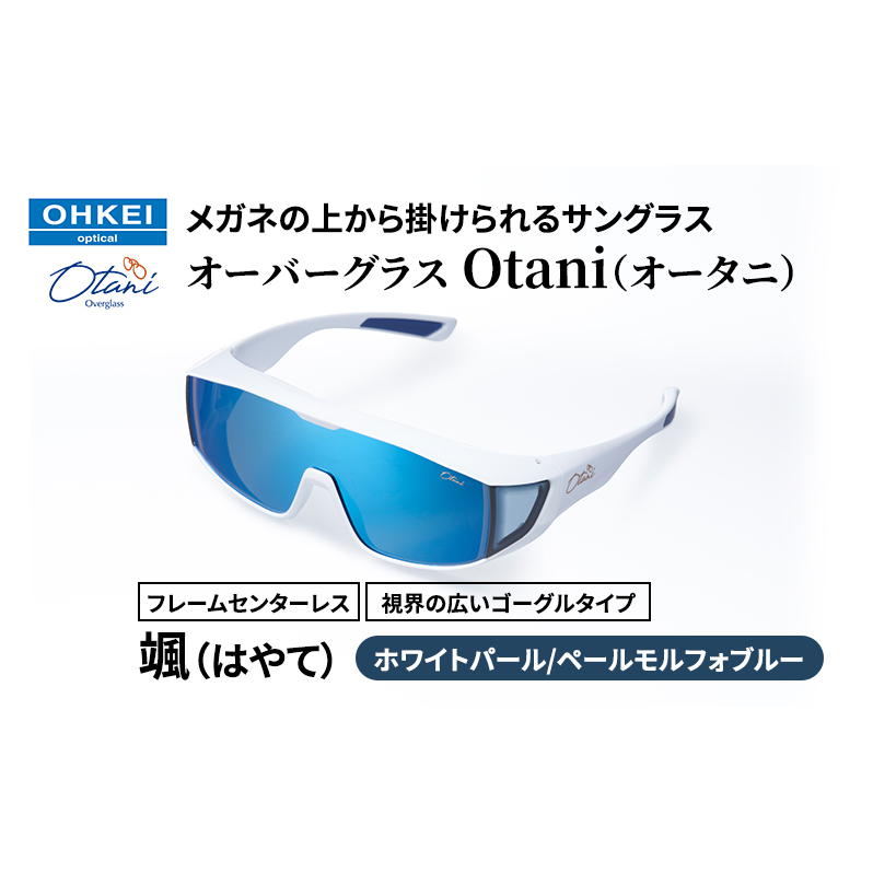 メガネの上から掛けられるサングラス オーバーグラス「Otani(オータニ)」フレームセンターレス、視界の広いゴーグルタイプ「颯(はやて)」(7)ホワイトパール/ペールモルフォブルー