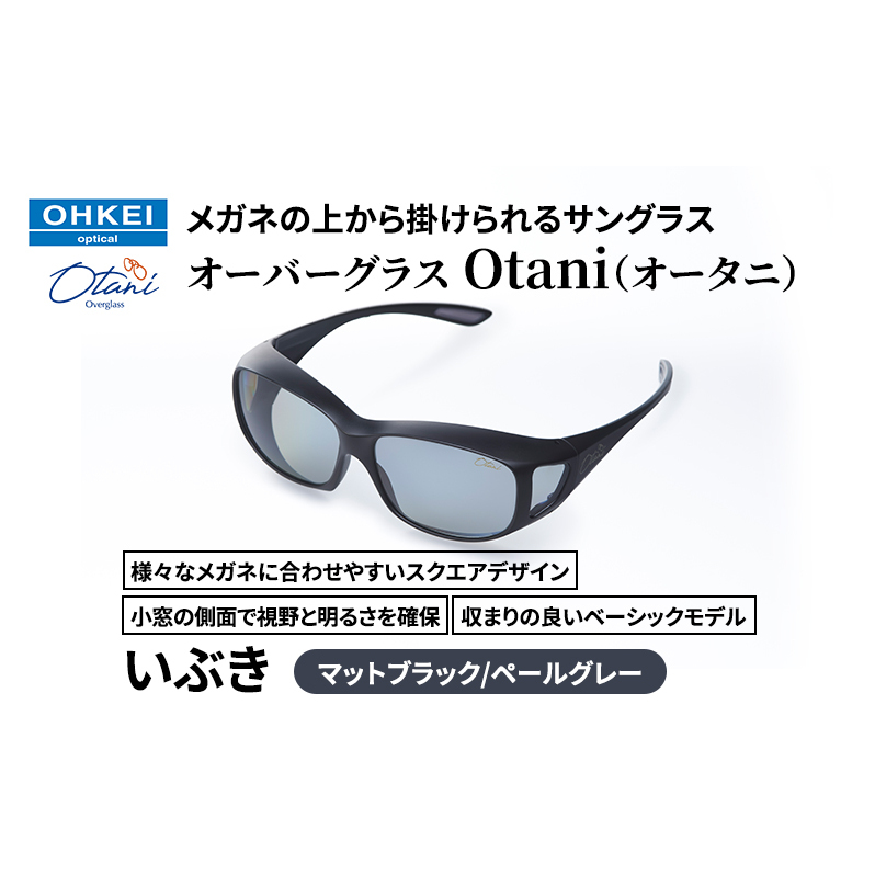 メガネの上から掛けられるサングラス オーバーグラス「Otani(オータニ)」様々なメガネに合わせやすいスクエアデザイン、小窓の側面で視野と明るさを確保、収まりの良いベーシックモデル。「いぶき」(1)マットブラック/ペールグレー